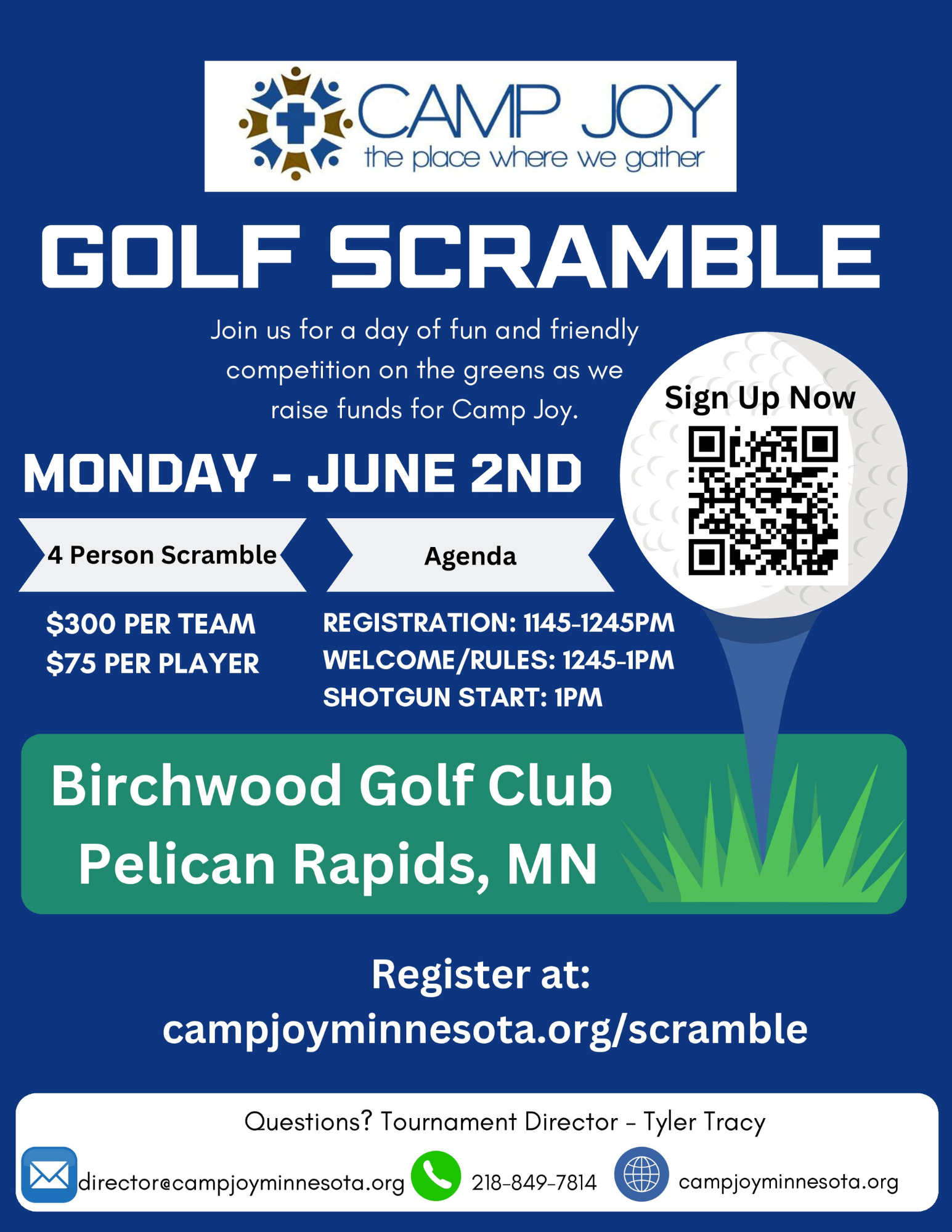 Welcome to the inaugural Camp Joy Golf Scramble. Camp Joy's mission is to share the gospel of Jesus Christ through exciting camping experiences, teaching campers that true JOY comes from serving Jesus first, Others second, and Yourself last. Funds from this golf scramble help us work towards our mission through supporting counselors, support staff and volunteers. This is a 4 person best ball scramble, so grab some friends, enjoy a great day of golf and support Camp Joy!