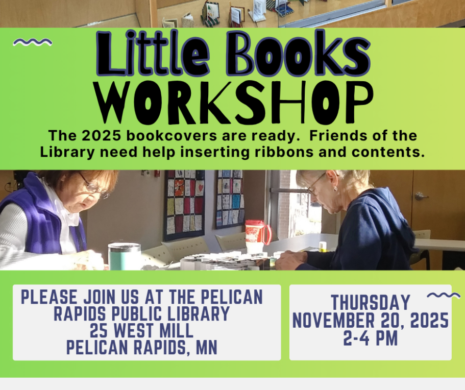 The Little Book covers are ready. Come help Friends of the Pelican Rapids Library. You will be inserting ribbons and contents as they prepare to put the Little Books on sale.