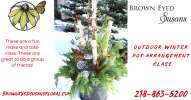 Brown Eyed Susans is offering our outdoor Winter Pot Arrangement classes. The class fee covers the basic assembly; additional embellishments available for purchase. Class fee is $50. If you have groups of 4-10, we can host a separate class for you ...